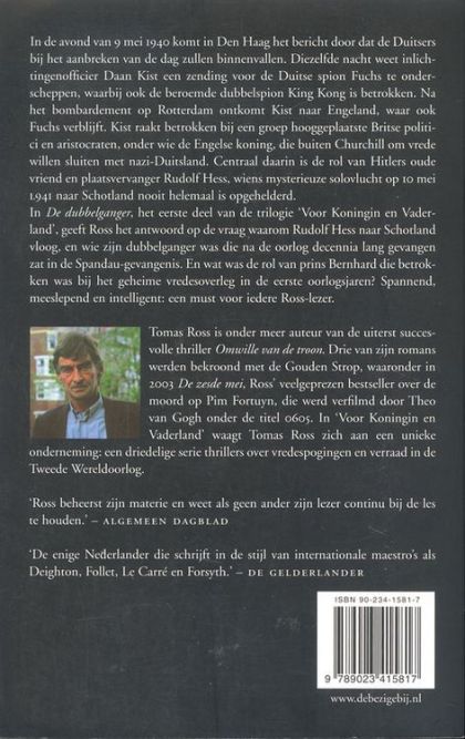 In de avond van 9 mei 1940 komt in Den Haag het bericht door dat Hitler bij het aanbreken van de dag zal binnenvallen. Diezelfde nacht weet inlichtingenofficier Daan Kist een zending voor de Duitse spion Fuchs te onderscheppen, waarbij ook de beroemde dubbelspion King Kong is betrokken. Na het bombardement op Rotterdam ontkomt Kist naar Engeland, waar ook Fuchs verblijft. Kist raakt betrokken bij een groep hooggeplaatste Britse politici en aristocraten, onder wie de Engelse koning, die buiten Churchill om vrede willen sluiten met nazi-Duitsland. Centraal daarin is de rol van Hitlers oude vriend en plaatsvervanger Rudolf Hess, wiens mysterieuze solovlucht op 10 mei l941 naar Schotland nooit helemaal is opgehelderd... Tomas Ross is auteur en scenarist. Hij is onder meer auteur van het uiterst succesvolle Omwille van de troon, waarvan tot nu toe meer dan 35.000 exemplaren zijn verkocht. Drie van zijn romans werden bekroond met de Gouden Strop, waaronder in 2003 De zesde mei, Ross' veelgeprezen bestseller over de moord op Pim Fortuyn, die werd verfilmd door Theo van Gogh onder de titel 0605. In Voor Koningin en Vaderland waagt Tomas Ross zich aan een unieke onderneming: een driedelige serie thrillers over vredespogingen en verraad in de Tweede Wereldoorlog. 'Ross beheerst zijn materie en weet als geen ander zijn lezer continu bij de les te houden.' Algemeen Dagblad 'Onze beste misdaadauteur.' Vrij Nederland