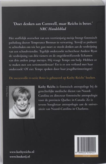 Het stoffelijk overschot van een veertienjarig meisje brengt forensisch patholoog doctor Temperance Brennan in verwarring. Terwijl ze probeert te achterhalen om wie het gaat moet ze steeds denken aan de verdwijning van een schoolvriendin. Tegelijk onderzoekt rechercheur Andrew Ryan de verdwijning van drie tieners en de ongeïdentificeerde lichamen van drie andere jonge meisjes. Hij vraagt Tempe om hulp. NBD|Biblion recensie Forensisch antropologe Temperance (Tempe) Brennan raakt in Quebec betrokken bij het onderzoek naar het skelet van een vele jaren geleden gestorven jong meisje. Het intrigeert haar omdat het haar herinnert aan haar destijds spoorloos verdwenen jeugdvriendinnetje Evangeline. Tempes vriend, rechercheur Ryan, onderzoekt intussen een reeks moorden en vermissingen van jonge meisjes waarbij waarschijnlijk een seriemoordenaar in het spel is. Hij vraagt Temperance om hulp. Een onderzoek volgt met schokkende ontdekkingen waarbij Temperance en Ryan zelf ook in gevaarlijke situaties terechtkomen. De romantische verwikkelingen van Tempe en Ryan, Tempes ex-man Pete en haar zus Harry spelen weer een rol in het verhaal. Verder verneemt de lezer in deze tiende misdaadroman rond Tempe Brennan voor het eerst meer over haar jeugd. Spannend, boeiend en met uiteraard weer veel aandacht voor de forensische details: de Amerikaanse schrijfster (1950) is immers zelf forensisch antropologe. Zelfstandig te lezen, maar leuker als je de vorige delen ook kent. De ook in Nederland uitgezonden televisieserie 'Bones' is gebaseerd op zowel de persoon Kathy Reichs als op haar boeken.