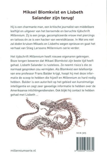 Mikael Blomkvist en Lisbeth Salander zijn terug! Hij is een charmante man, een kritische journalist van middelbare leeftijd, en uitgever van het beroemde en beruchte tijdschrift Millennium. Zij is een jonge, gecompliceerde vrouw met piercings en tattoos én ze is een computerhacker van wereldklasse. In Wat ons niet zal doden kruisen Mikaels en Lisbeths wegen opnieuw en gaat hun verhaal van Stieg Larssons Millennium-serie verder. Het tijdschrift Millennium heeft nieuwe eigenaren gekregen. Boze tongen beweren dat Mikael Blomkvist zijn beste tijd heeft gehad. Lisbeth Salander is rusteloos. Ze neemt risico's die ze normaal gesproken zou vermijden. Als Blomkvist een telefoontje van ene professor Frans Balder krijgt, hoopt hij met deze informatie de scoop te hebben die hijzelf en Millennium zo hard nodig hebben. Balder is een autoriteit op het gebied van kunstmatige intelligentie en zegt zeer gevoelige informatie te hebben over de Amerikaanse inlichtingendiensten. Hij voelt zich bedreigd en heeft haast om zijn verhaal te doen. Ook blijkt hij contact te hebben gehad met Lisbeth. Nog een reden voor Blomkvist om Balder op te zoeken. Maar de ontmoeting loopt niet zoals gepland...