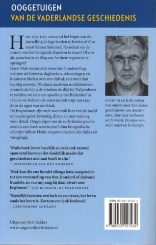 Hoe was het om rond het begin van de jaartelling de lage landen te bereizen? Om naast Kenau Simonsd. Hasselaar op de muren van het belegerde Haarlem te staan? Of om als parachutist de slag om Arnhem tegemoet te springen? Geert Mak verzamelde meer dan honderd fragmenten uit brieven, dagboeken, reisverslagen en krantenartikelen over een tijdvak van meer dan twintig eeuwen. We staan naast een middeleeuwse monnik als hij in de vrieskou de dijk bij Tiel probeert te redden, we zien een spook op het Buitenhof in 1812 en we beleven de watersnoodramp van 1953 door de ogen van een kind. De fragmenten zijn stuk voor stuk heet van de naald op papier gezet, levendig, direct en met veel oog voor detail. Ooggetuigen van de vaderlandse geschiedenis is een boek waarin met bijna fotografische scherpte talloze kleine en grote tekenen des tijds zijn vastgelegd.