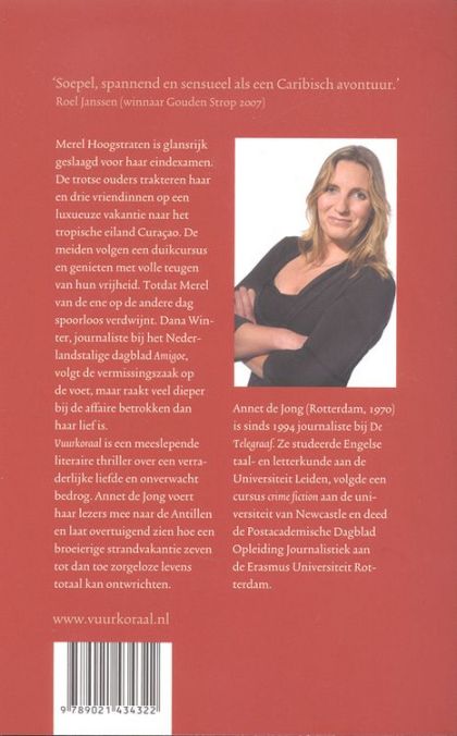 Merel Hoogstraten is glansrijk geslaagd voor haar eindexamen. De trotse ouders trakteren haar en drie vriendinnen op een luxueuze vakantie naar het tropische eiland Curaçao. De meiden volgen een duikcurcus en genieten met volle teugen van hun vrijheid. Totdat Merel van de ene op de andere dag verdwijnt. Dana Winter, journaliste bij het Nederlandstalige dagblad Amigoe, volgt de vermissingszaak op de voet, maar raakt veel dieper bij de affaire betrokken dan haar lief is. Vuurkoraal is een meeslepende literaire triller over een verraderlijke liefde en onverwacht bedrog. Annet de Jong voert haar lezers mee naar de Antillen en laat overtuigend zien hoe een broeierige strandvakantie zeven tot dan toe zorgeloze levens totaal kan ontwrichten.