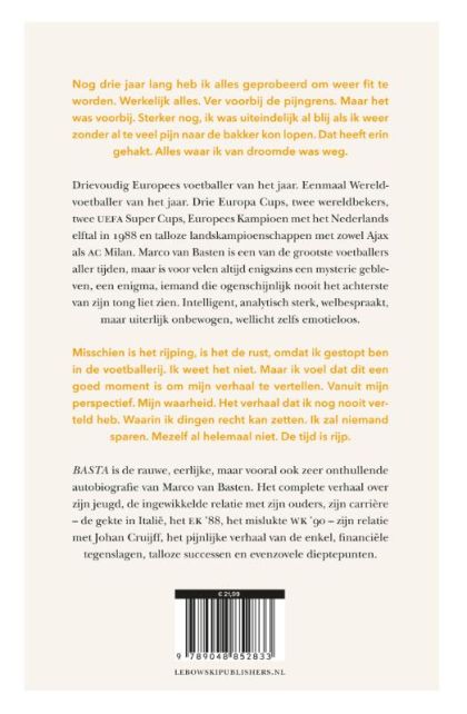 In 'BASTA' laat Van Basten geen steen onopgetild: over zijn jeugd en familie, Ajax, uiteraard het EK '88, de gekte in Italië en het pijnlijke verhaal van de enkel. Hij vertelt over de onvoorstelbare financiële ellende, de relatie met Johan Cruijff, zijn periode als trainer en nog veel meer. Successen en dieptepunten volgen elkaar in rap tempo op in deze fascinerende biografie.