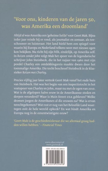 Mak - gevierd en geliefd chroniqueur van Amsterdam (De engel van Amsterdam, Een kleine geschiedenis van Amsterdam) van Nederland (Hoe God verdween uit Jorwerd, De eeuw van mijn vader), en van Europa (In Europa, De hond van Tisma) - deelt zijn liefde voor en kennis over Amerika met ons in zijn nieuwste boek Reizen zonder John - Op zoek naar Amerika