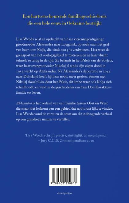 Genomineerd voor de Libris Literatuur Prijs 2022.00Met verbluffend vertelplezier en met alle literaire stijlmiddelen die tot haar beschikking staan vertelt Lisa Weeda een uitzonderlijke familiegeschiedenis, die begint bij haar grootmoeder Aleksandra. In 1942 wordt zij vanuit Oekraïne gedeporteerd en in Duitsland in de oorlogsindustrie tewerkgesteld. Haar kleindochter Lisa reist later naar haar grootmoeders geboorteplaats en ontmoet, op de vleugels van haar verbeelding, haar overgrootvader Nikolaj, die al bijna driekwart eeuw op zijn dochter zit te wachten. Samen met hem gaat ze op zoek naar sporen van haar neef, die tijdens het recentelijk opgelaaide conflict in Oost-Oekraïne is vermoord.0'Aleksandra' is het verhaal van een familie tussen Oost en West die maar niet loskomt van een gebied dat nooit rust lijkt te vinden. Lisa Weeda vond de vorm en de stem om dit indringende verhaal op een grandioze manier te vertellen.00Lisa Weeda is een Nederlands-Oekraïense schrijver, literair programmamaker, scenarist, audiofan en virtual reality-regisseur. Tekst is altijd de basis van haar werk, maar vorm staat vrij. Oekraïne, het moederland van haar grootmoeder, staat vaak centraal in haar werk. 'Aleksandra' is haar debuutroman.