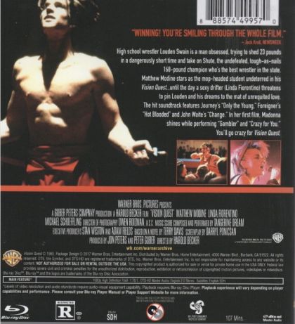 High school wrestler Louden Swain is a man obsessed , trying to shed 23 pounds in a dangerously short time and take on Shute, the undefeated, tough-as-nails 168-pound champion who's the best wrestler in the state. Matthew Modine stars as the mop-headed student undeterred in his Vision Quest...until a day a sexy drifter threatens to pin Louden and his dreams to the mat of unrequited love.