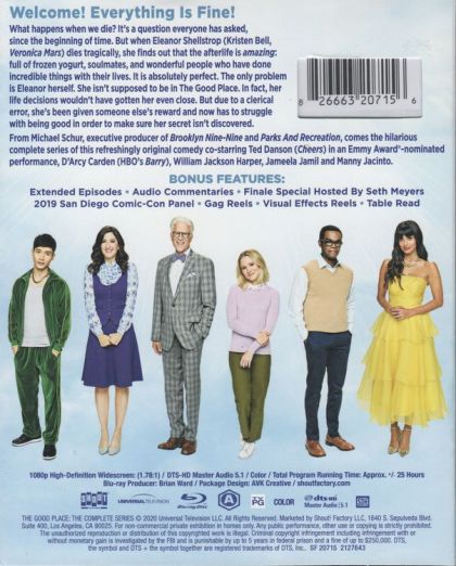 Eleanor Shellstrop is an ordinary woman who, through an extraordinary string of events, enters the afterlife where she comes to realize that she hasn't been a very good person. With the help of her wise afterlife mentor, she's determined to shed her old way of living and discover the awesome (or at least the pretty good) person within.
