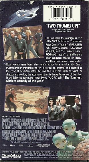 For four years, the courageous crew of the NSEA protector - "Commander Peter Quincy Taggart" (Tim Allen), "Lt. Tawny Madison (Sigourney Weaver) and "Dr.Lazarus" (Alan Rickman) - set off on a thrilling and often dangerous mission in space...and then their series was cancelled! Now, twenty years later, aliens under attack have mistaken the Galaxy Quest television transmissions for "historical documents" and beam up the crew of has-been actors to save the universe. With no script, no director and no clue, the actors must turn in the performances of their lives.