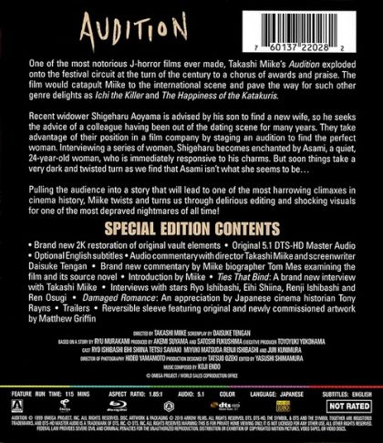 Seven years after the death of his wife, widower Shigeharu seeks advice on how to find a new wife from a colleague. Taking advantage of their position as a film company, they stage an audition. Interviewing a series of women, Shigeharu is enchanted by the quiet Asami. But soon things take a twisted turn as Asami isn’t what she seems to be.