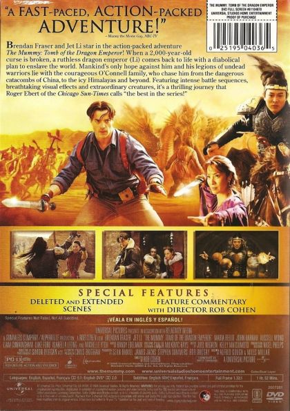 Archaeologist Rick O'Connell travels to China, pitting him against an emperor from the 2,000-year-old Han dynasty who's returned from the dead to pursue a quest for world domination. This time, O'Connell enlists the help of his wife and son to quash the so-called 'Dragon Emperor' and his abuse of supernatural power.