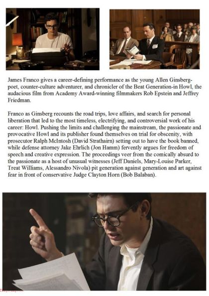 It's San Francisco in 1957, and an American masterpiece is put on trial. Howl, the film, recounts this dark moment using three interwoven threads: the tumultuous life events that led a young Allen Ginsberg to find his true voice as an artist, society's reaction (the obscenity trial), and mind-expanding animation that echoes the startling originality of the poem itself. All three coalesce in a genre-bending hybrid that brilliantly captures a pivotal moment-the birth of a counterculture.