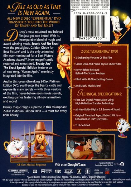 | Extras | 3 Enchanting Versions of the Film Celine Dion and Peabo Bryson Music Video Never-Before-Released Beh |