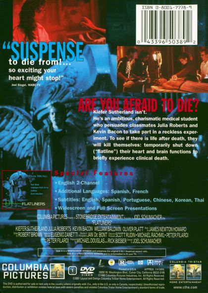 Five medical students want to find out if there is life after death. They plan to stop one of their hearts for a few seconds, thus simulating death, and then bring the person back to life. A science fiction thriller from the early 1990's with a star studded cast.