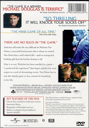 In honor of his birthday, San Francisco banker Nicholas Van Orton, a financial genius and a cold-hearted loner, receives an unusual present from his younger brother, Conrad: a gift certificate to play a unique kind of game. In nearly a nanosecond, Nicholas finds himself consumed by a dangerous set of ever-changing rules, unable to distinguish where the charade ends and reality begins.