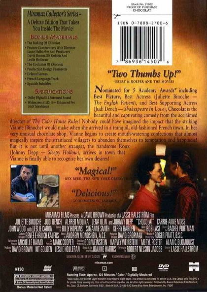 | Extras | The Making Of Chocolat Feature Commentary With Director Lasse Hallstrom and Producers David Brown, K |