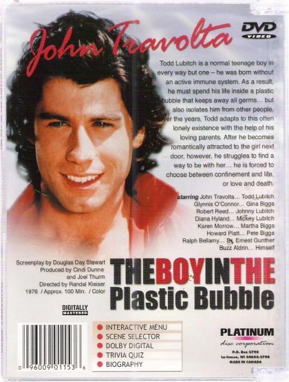 Based on a true story, Tod Lubitch is born with a deficient immune system (which is unlike being born with AIDS). As such, he must spend the rest of his life in a completely sterile environment. His room is completely hermetically sealed against bacteria and virus, his food is specially prepared, and his only human contact comes in the form of gloved hands. The movie follows his life into a teenager