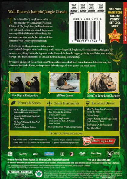 The boy Mowgli makes his way to the man-village with Bagheera, the wise panther. Along the way he meets jazzy King Louie, the hypnotic snake Kaa and the lovable, happy-go-lucky bear Baloo, who teaches Mowgli "The Bare Necessities" of life and the true meaning of friendship.