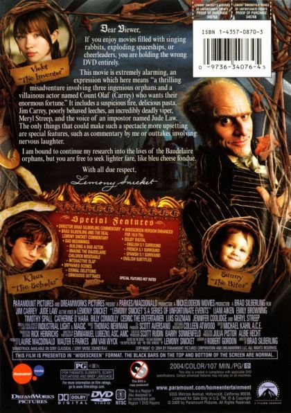 | Extras | Commentary with Director Brad Silberling Brad Silberling and the Real Lemony Snicket Commentary Bad |
