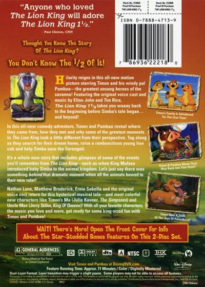 | Extras | Deleted Scenes Hidden Mickey Hunt Timon: Behind The Legend Before the Beginning: The Making of The L |