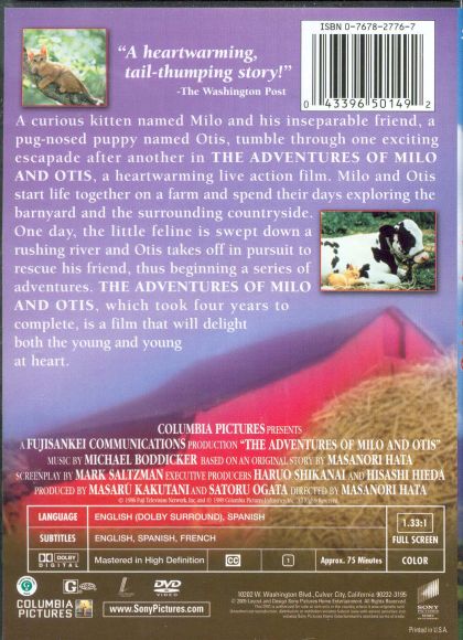 The story of two animals and their adventures. Milo, the cat, and Otis, the dog, are two animals who grew up together on the same farm. One day, the two are separated and begin a journey to find each other. The adventurous, and often perilous quest finds the two animals traveling across mountains, plains, and snow-covered lands searching for one another.