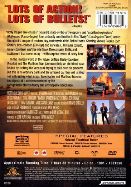 It's the lawless future, and renegade biker Harley Davidson (Mickey Rourke) and his surly cowboy buddy, Marlboro (Don Johnson), learn that a corrupt bank is about to foreclose on their friend's bar to further an expanding empire. Harley and Marlboro decide to help by robbing the crooked bank. But when they accidentally filch a drug shipment, they find themselves on the run from criminal financiers and the mob in this rugged action adventure.
