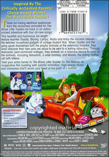 Those fun-loving eletrical appliances from the acclaimed animated hit 'The Brave Little Toaster' are back in an action-packed adventure with four all-new songs. This heartfelt and humorous full-length feature reunites Toaster, Blanky, Lampy, Radio and Kirby the vacuum cleaner--the beloved household gadgets of college student Rob. When Toaster and the gang spark freindships with the playful animals at the veterinary hospital, they soon discover their new pals are about to be sent to a testing laboratory. Through teamwork (and combined voltage), they embark on a hilarious rescue to save all the animals, including Sebastion, a wise monkey, and Maisie, the doting mother cat with kittens.Treat your entire family to 'The Brave Little Toaster To The Rescue', an imaginative film bursting with colorful animation, high-energy music and characters that'll warm your heart at the push of a button!