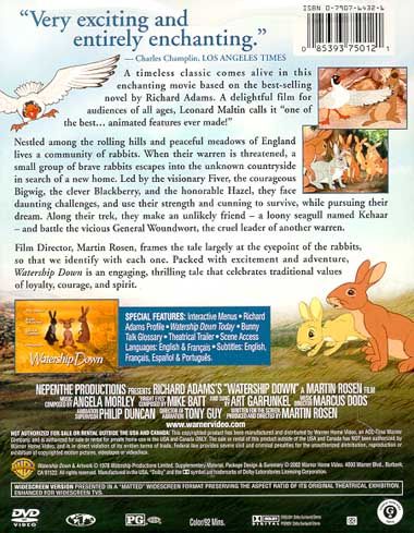 | Extras | Interactive Menus Richard Adams Profile Watership Down Today Bunny Talk Glossary Theatrical Trailer |