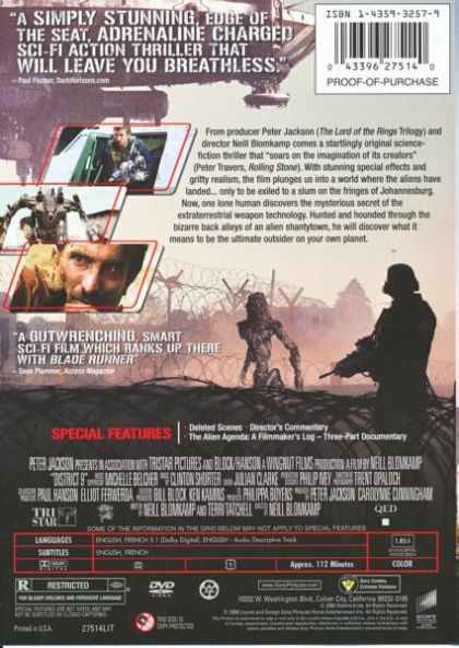Thirty years ago, aliens arrive on Earth. Not to conquer or give aid, but to find refuge from their dying planet. Separated from humans in a South African area called District 9, the aliens are managed by Multi-National United, which is unconcerned with the aliens' welfare but will do anything to master their advanced technology. When a company field agent contracts a mysterious virus that begins to alter his DNA, there is only one place he can hide: District 9.
