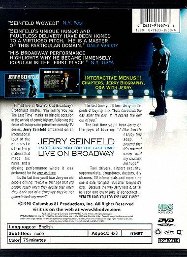 Taped for HBO in August 1998, on the final date of Jerry Seinfeld's tour appearances at New York City's Broadhurst Theater, I'm Telling You for the Last Time presents the standup comedian's so-called "final" standup, or at least his final tour with the standup material that made him famous.