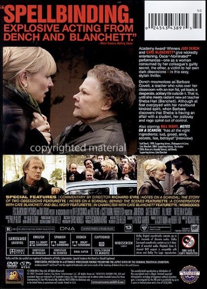 | Extras | Commentary by Director Richard Eyre Notes On A Scandal: The Story of Two Obsessions Featurette Notes |