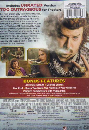 | Extras | • Alternate Scenes• Deleted Scenes• Gag Reel• Damn You Gods: The Making of Your Highness• Feature Co |
