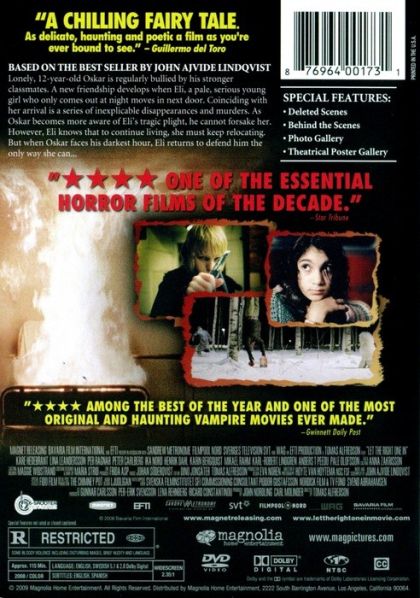Set in 1982 in the suburb of Blackeberg, Stockholm, twelve-year-old Oskar is a lonely outsider, bullied at school by his classmates; at home, Oskar dreams of revenge against a trio of bullies. He befriends his twelve-year-old, next-door neighbor Eli, who only appears at night in the snow-covered playground outside their building.