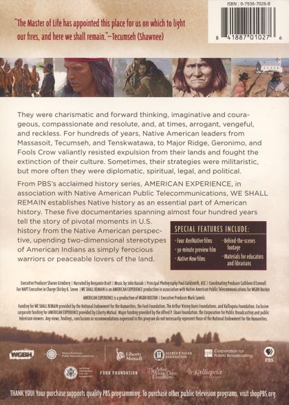 From PBS's acclaimed history series, AMERICAN EXPERIENCE, in association with Native American Public Telecommunications, WE SHALL REMAIN establishes Native history as an essential part of American history. These five documentaries spanning three hundred years tell the story of pivotal moments in U.S. history from the Native American perspective, upending two-dimensional stereotypes of American Indians as simply ferocious warriors or peaceable lovers of the land.