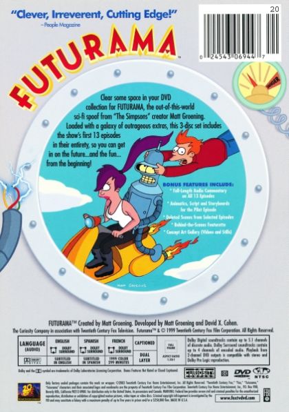 Accidentally frozen, pizza-deliverer Fry wakes up 1,000 years in the future. He is taken in by his sole descendant, an elderly and addled scientist who owns a small cargo delivery service. Among the other crew members are Capt. Leela, accountant Hermes, intern Amy, obnoxious robot Bender and lobsterlike moocher "Dr." Zoidberg.