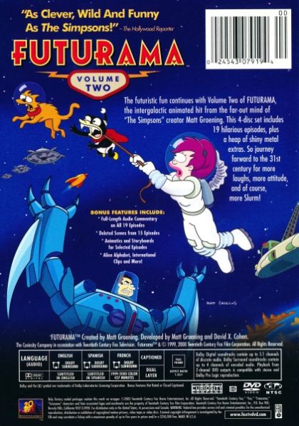 Accidentally frozen, pizza-deliverer Fry wakes up 1,000 years in the future. He is taken in by his sole descendant, an elderly and addled scientist who owns a small cargo delivery service. Among the other crew members are Capt. Leela, accountant Hermes, intern Amy, obnoxious robot Bender and lobsterlike moocher "Dr." Zoidberg.