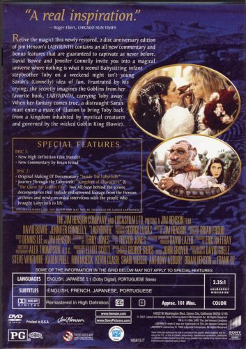 | Extras | New Commentary by Brian Froud Original Making Of Documentary Inside The Labyrinth Journey Through th |