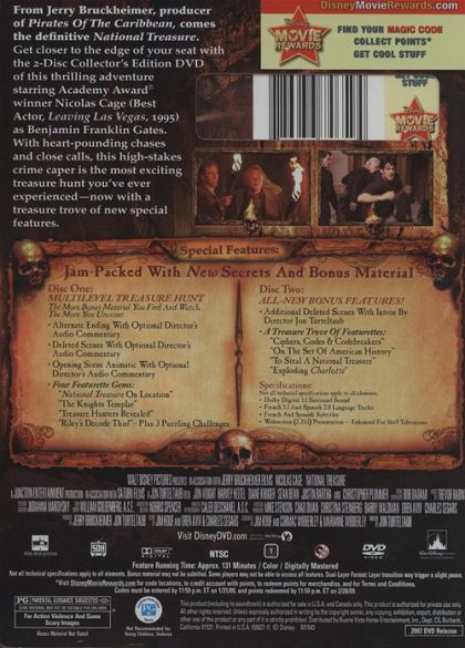 Modern treasure hunters, led by archaeologist Ben Gates, search for a chest of riches rumored to have been stashed away by George Washington, Thomas Jefferson and Benjamin Franklin during the Revolutionary War. The chest's whereabouts may lie in secret clues embedded in the Constitution and the Declaration of Independence, and Gates is in a race to find the gold before his enemies do.
