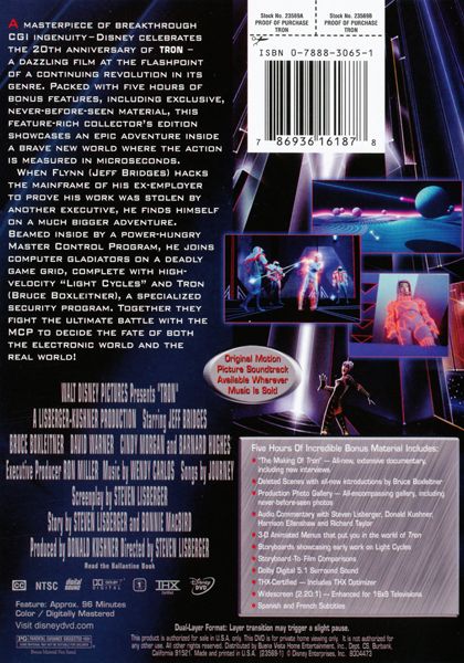 | Extras | Five Hours of Incredible Bonus Material Includes: "The Making of Tron" - All New, Extensive Document |