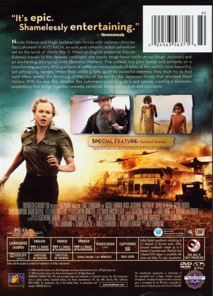 Set in northern Australia before World War II, an English aristocrat who inherits a sprawling ranch reluctantly pacts with a stock-man in order to protect her new property from a takeover plot. As the pair drive 2,000 head of cattle over unforgiving landscape, they experience the bombing of Darwin by Japanese forces firsthand.