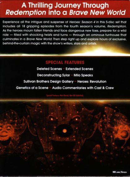 | Extras | Deconstructing Sylar; Milo Speaks; Sullivan Brothers Design Gallery; Heroes Revolution; Genetics of |