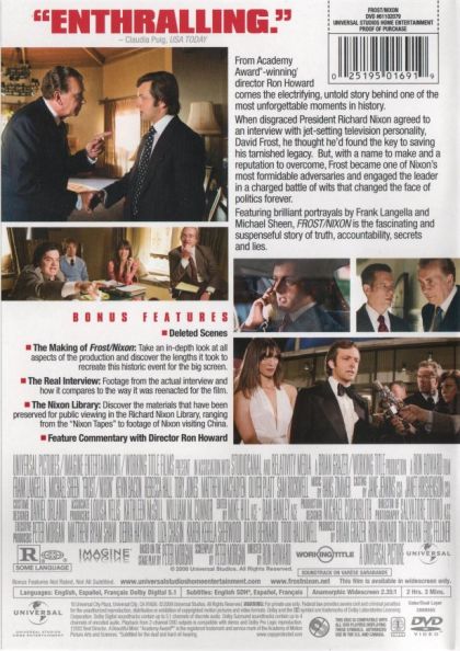 | Extras | - Deleted Scenes - The Making of Frost/Nixon: Take an in-depth look at all aspects of the production |