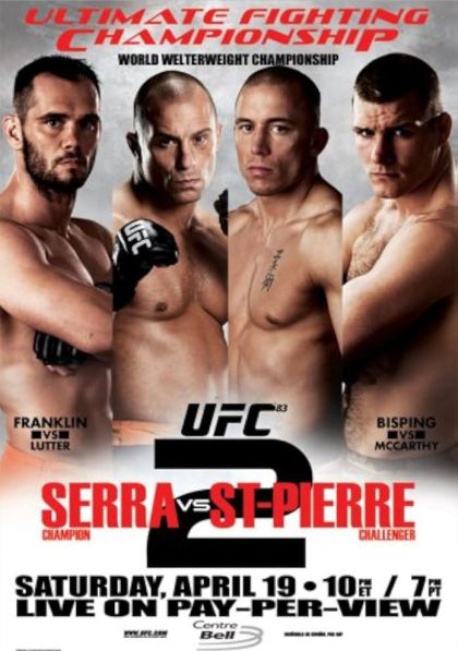 UFC 83: Serra vs St-Pierre 2 was a mixed martial arts event held by the Ultimate Fighting Championship. The event was held on April 19, 2008, at the Bell Centre in Montreal, Quebec, Canada. UFC 83 was the UFC's first event in Canada. It was headlined by UFC Welterweight Champion Matt Serra and UFC Interim Welterweight Champion Georges St. Pierre in a match to unify the championship.