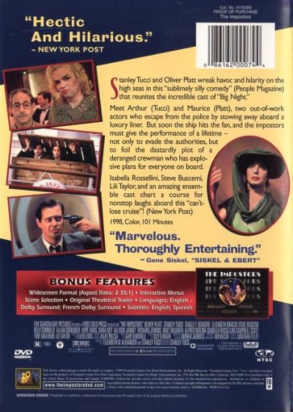 In an attempt to resurrect the slapstick comedy of Laurel and Hardy or The Marx Brothers, Stanley Tucci and Oliver Platt team-up as two out-of-work actors who accidentally stow away on a ship to hide from a drunken, belligerent lead actor who has sworn to kill them for belittling his talents.