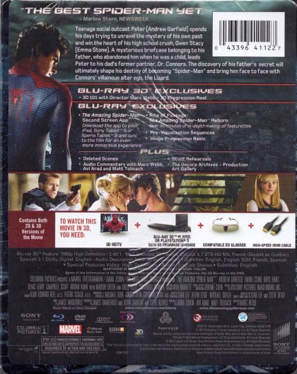 | Extras | 3D 101 With Director Marc Webb 3D Progression Reel The Amazing Spider-Man Second Screen App Download |