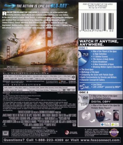 | Extras | - Rise of the Planet of the Apes in High Definition - 11 Deleted Scenes - The Senius of Andy Serkis |
