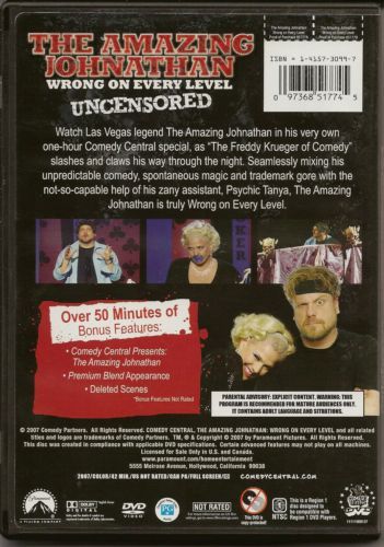 Part comedian, part madman magician The Amazing Johnathan brings his unique brand of comedy to DVD in The Amazing Johnathan: Wrong On Every Level – Uncensored. This all-new Comedy Central special showcases "The Madman of Comedy" at his best, hilariously skewering one magic trick after another with unexpected and sometimes gory results.