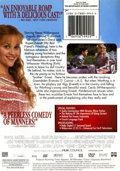 | Extras | Audio Commentary with Director Oliver Parker The Making Of The Importance Of Being Ernest Behind-The |