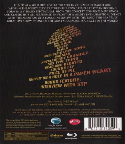 Filmed at a sold out Riviera Theatre in Chicago in March 2010, Alive In The Windy City is the first Stone Temple Pilots live concert to be authorized for video release. The band are in top form and the show both looks and sounds spectacular. The concert was held shortly before the release of their recent Stone Temple Pilots album and the tracklisting combines new songs interspersed with their classic hits. This is a great live concert by one of the most successful rock acts of the last twenty years./ Line-up: Scott Weiland (lead vocals), Robert DeLeo (bass), Dean DeLeo (guitars), Eric Kretz (drums).