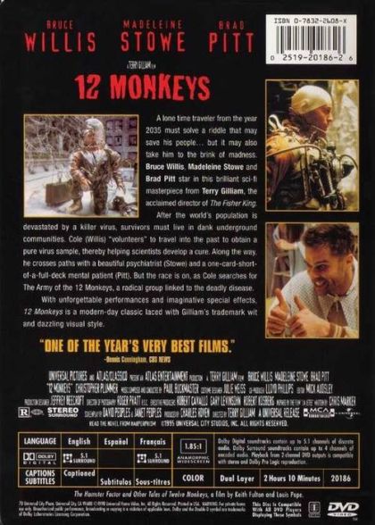 In the year 2035, convict James Cole reluctantly volunteers to be sent back in time to discover the origin of a deadly virus that wiped out nearly all of the earth's population and forced the survivors into underground communities. But when Cole is mistakenly sent to 1990 instead of 1996, he's arrested and locked up in a mental hospital. There he meets psychiatrist Dr. Kathryn Railly and the son of a famous virus expert who may hold the key to the Army of the 12 Monkeys; thought to be responsible for unleashing the killer disease.