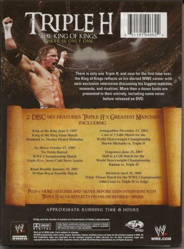 There is only one Triple H, and now for the first time ever, the "King of Kings" reflects on his storied WWE career with new exclusive interviews discussing his biggest matches, moments, and rivalries. More than a dozen bouts are presented in their entirety, including some never before released on DVD.