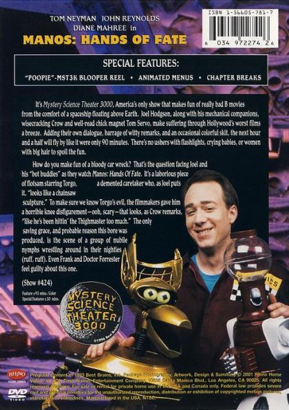 How do you make fun of a bloody car wreck? That's the question facing Joel and his "bot buddies" as they watch Manos: Hands of Fate, a laborious piece of flotsam starring Torgo, a demented caretaker who, as Joel puts it, "looks like a chainsaw sculpture." To make sure we know Torgo's evil, the filmmakers gave him a horrible knee disfigurement – ooh, scary – that looks, as Crow remarks, "Like he's been hittin' the Thighmaster too much." The only saving grace, and probable reason this bore was produced, is the scene of a group of nubile nymphs wrestling around in their nighties (ruff, ruff). Even Frank and Doctor Forrester feel guilty about this one.